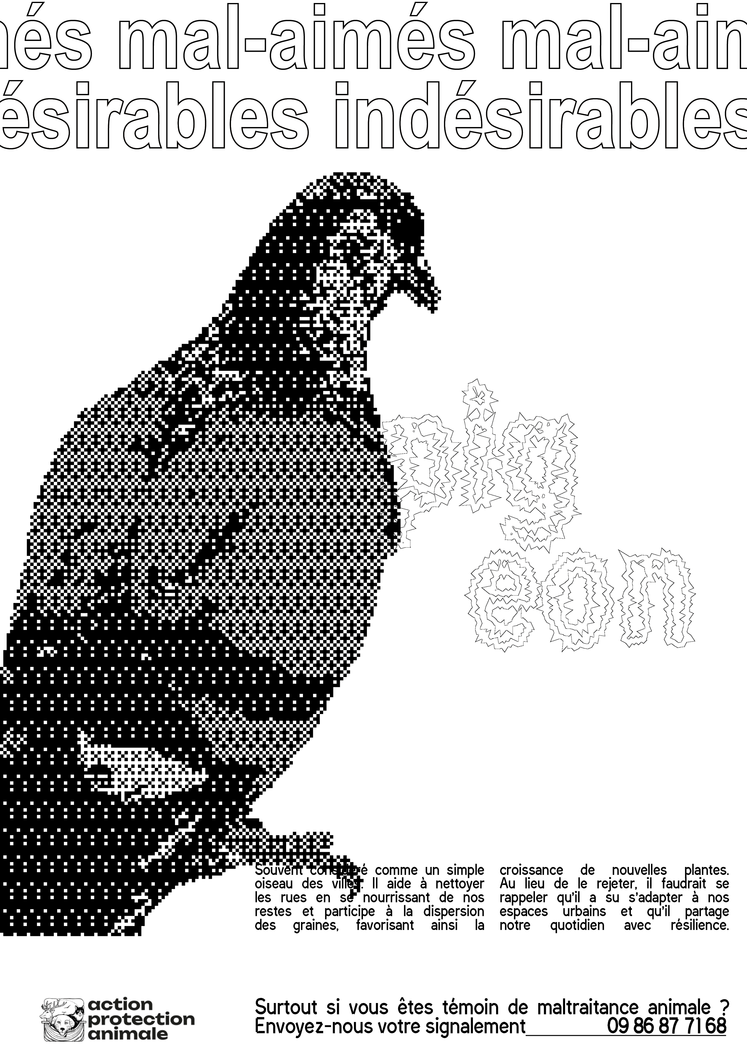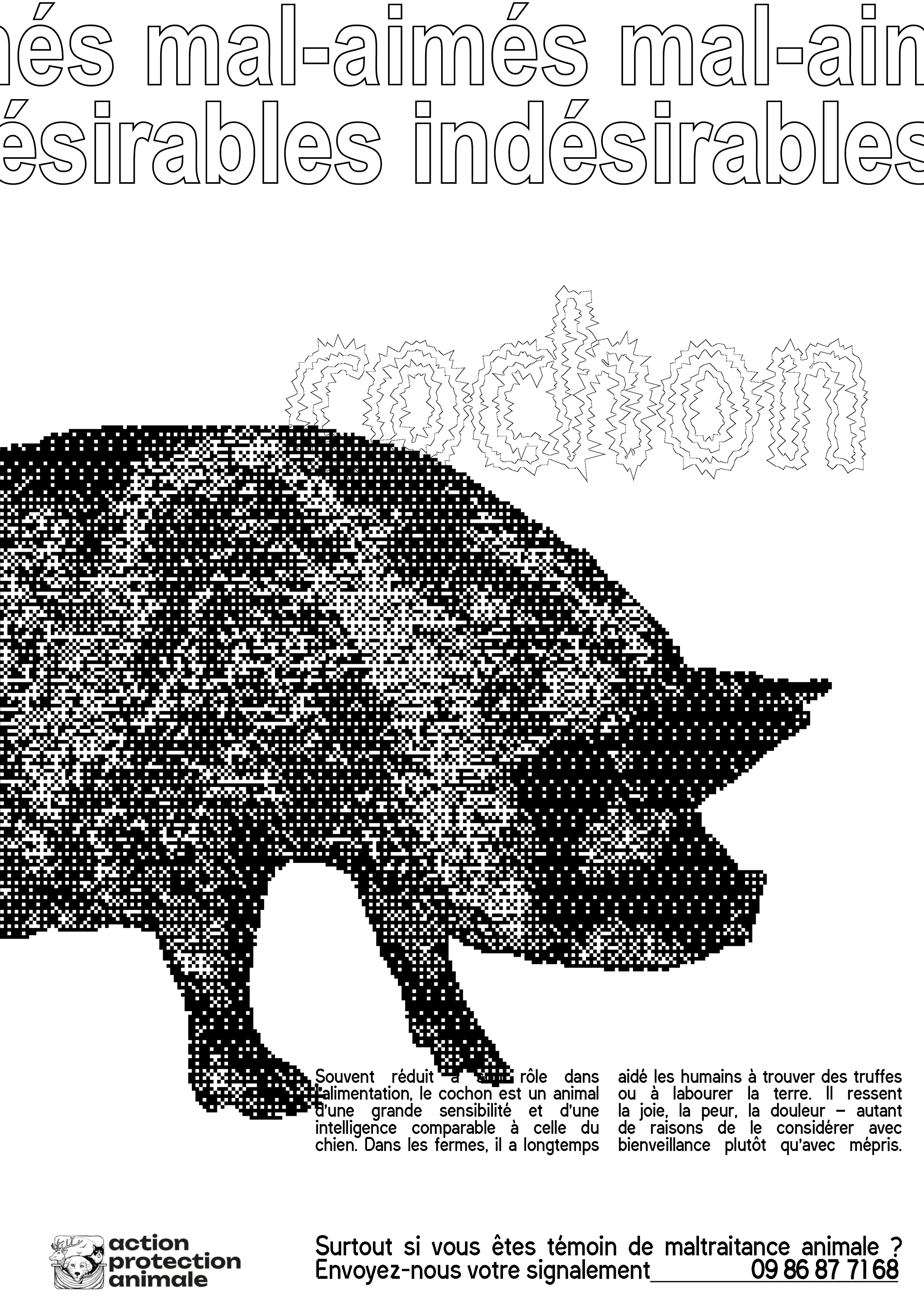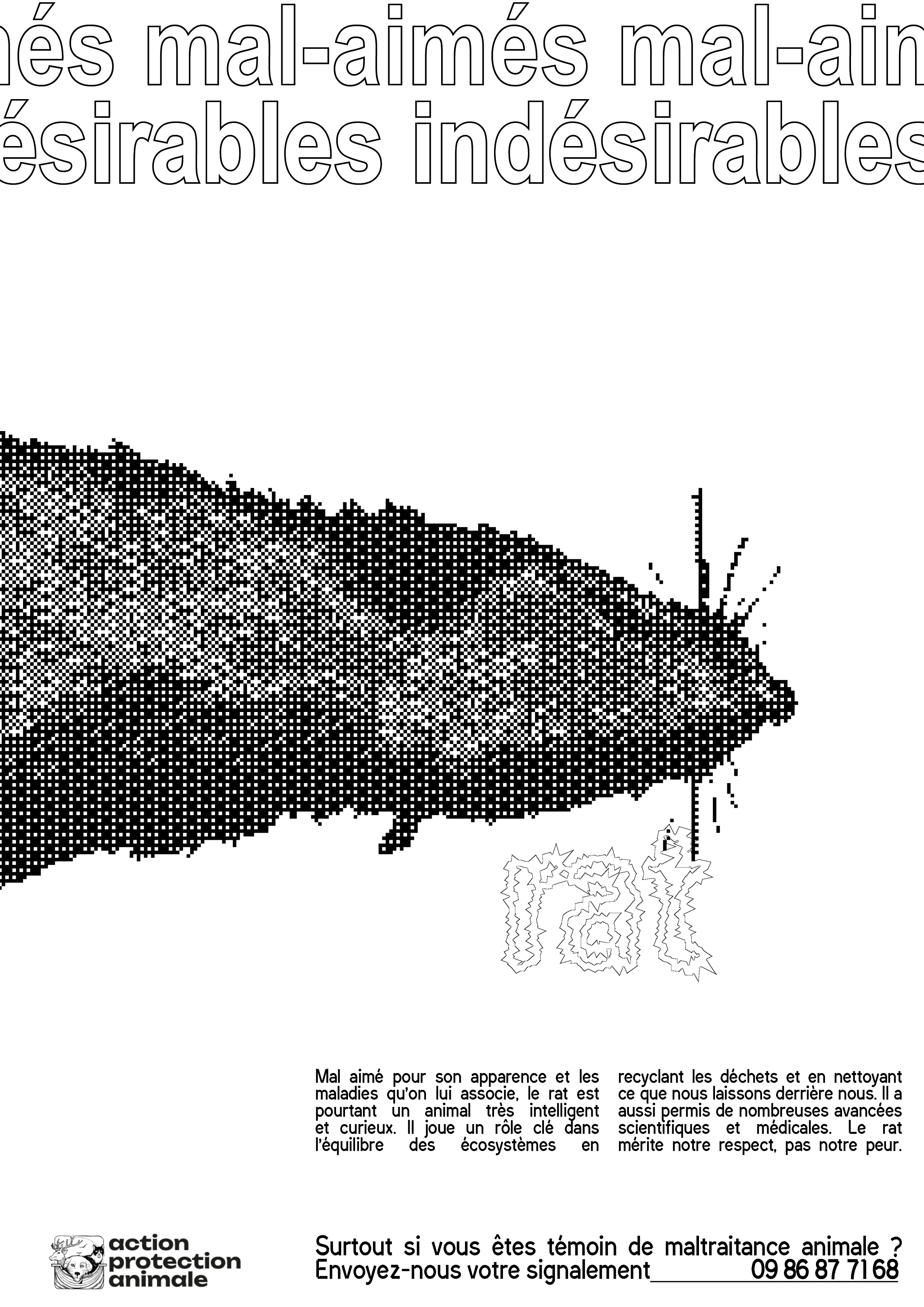 Affiches indésirables est une collection d’affiches de sensibilisation dédiée à la cause animale. Le projet part du constat que la représentation des animaux se limite souvent aux espèces jugées « aimables » ou spectaculaires, comme les chiens, les chats ou les animaux de la savane. Cette campagne met volontairement en avant des animaux mal-aimés, invisibilisés ou méprisés, tels que les cochons, les rats, les araignées ou les pigeons. L’intention est de rappeler que leur vie n’a pas moins de valeur et que la maltraitance dont ils sont victimes ne doit pas être ignorée. À travers un dispositif graphique fort, la campagne appelle à une prise de conscience et incite le public à contacter des associations de protection animale, comme Action Protection Animale, en cas de maltraitance constatée.